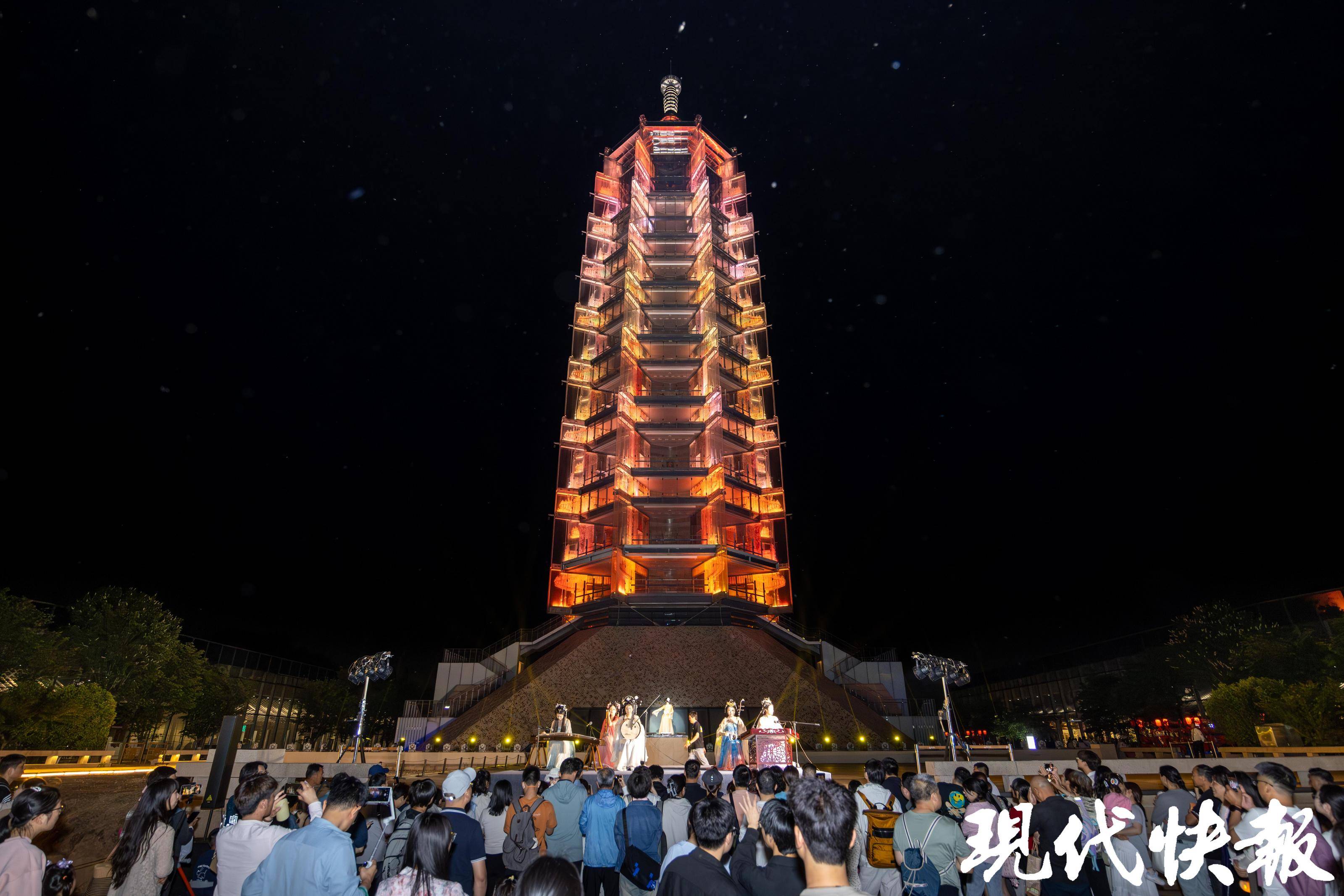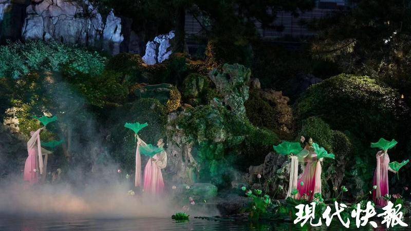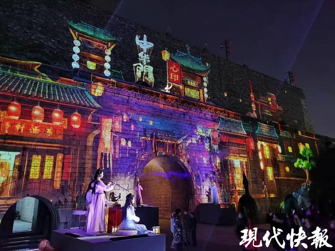 瞻園內(nèi),戲韻的婉轉(zhuǎn)唱腔與光影交織;大報恩寺遺址的琉璃塔下,古樂與星輝斑斕共舞;明城墻上,千年磚石在光雕中重現(xiàn)盛世畫卷……