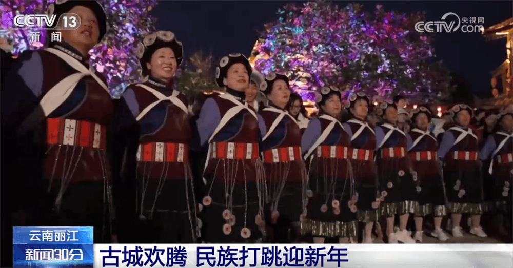 為迎接新年到來,麗江古城開展了云南特色的“打跳”舞蹈。在四方街廣場,身著納西族傳統(tǒng)服飾的當(dāng)?shù)乩习傩蘸吞炷系乇钡挠慰团笥褌兪掷?,大家以篝火為中心,伴著音樂?jié)奏一起舞動(dòng),溫暖的火光映照在笑臉上,人們在熱烈的氛圍中期待新一年的到來。
